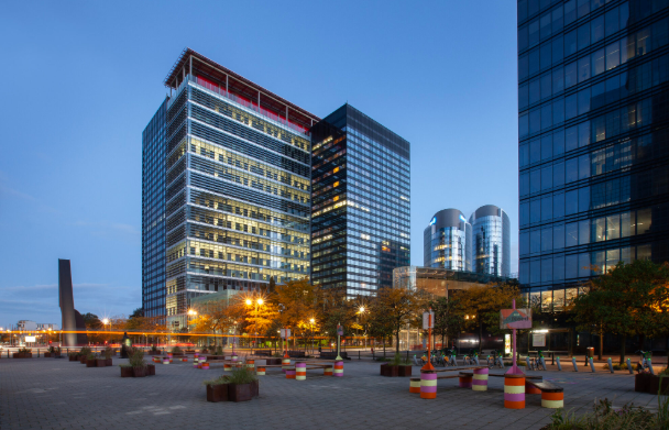 بدأ المشروع في عام 2018 وانتهى العام الماضي، وشمل تحويل برج مركز التجارة العالمي 1 الذي يبلغ ارتفاعه 111 مترًا من عصر السبعينيات إلى مجمع متعدد الاستخدامات يجمع بين المكاتب والإسكان والضيافة والمرافق العامة. قاد التصميم مكتب Jaspers-Eyers Architects بالتعاون مع 51N4E وl’AUC، وأدخل حياة شارع نشطة عبر جميع الطوابق الـ30 من خلال تراسات جديدة وحدائق ومساحات عامة.
